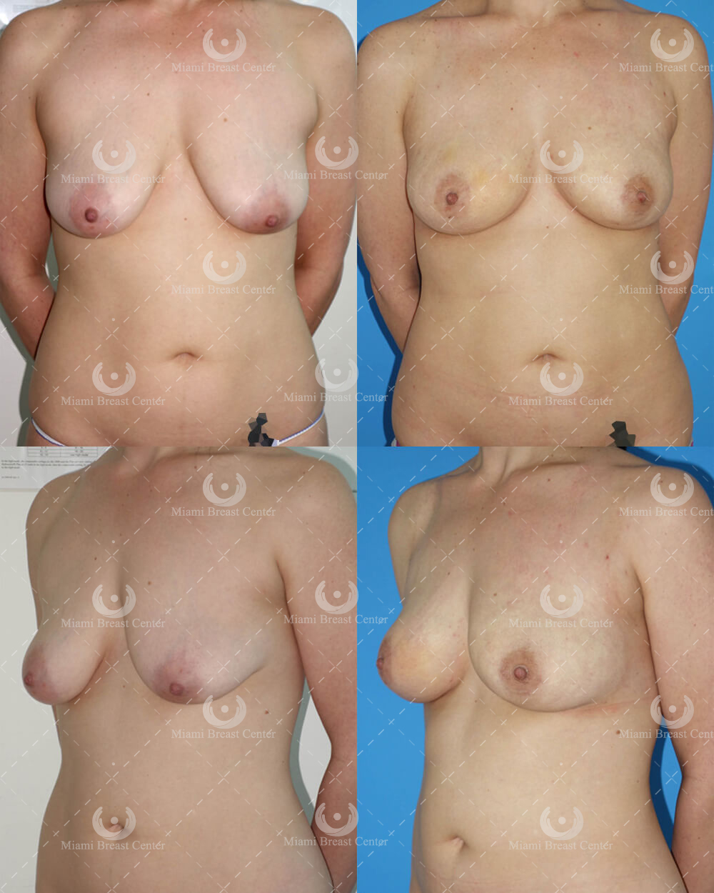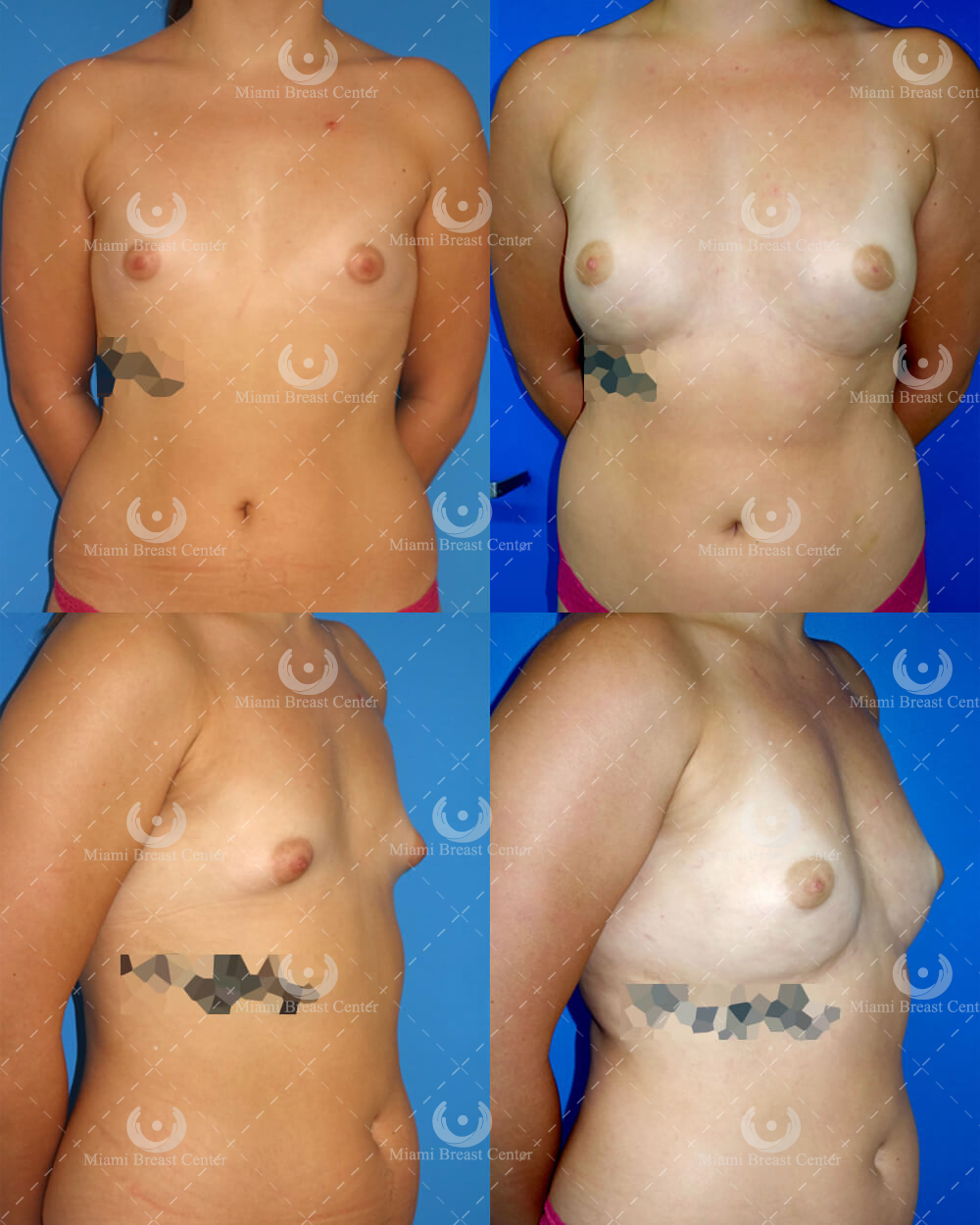 | Donor Site Pre- (above) and post- (below) liposuction photos show the improved body contour of the donor sites. Volume measurement from 3-D reconstructions of the baseline versus one-year follow up MRI shows a 270 mL augmentation per breast and more than 80% graft survival. |