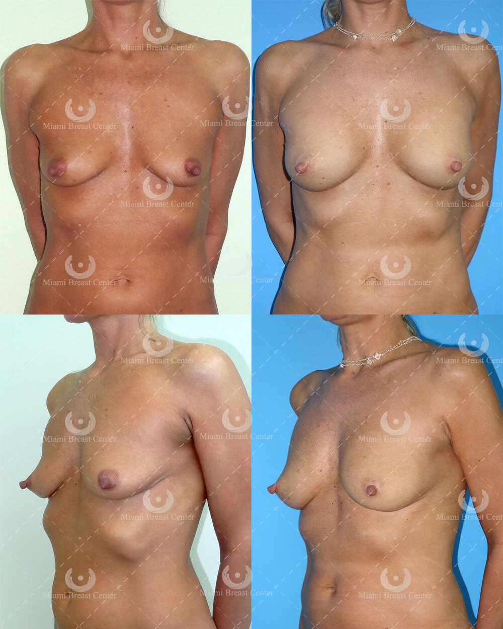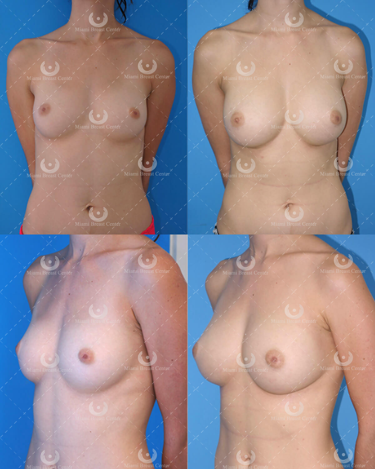 | After 9 Months Her natural-looking breast augmentation at 9-month follow up. She still shows some skin hyperpigmentation from wearing BRAVA, a not-too-uncommon effect in pigmented skin that can be treated with bleaching creams. Volumetric 3-D reconstruction of her pre- and post-RI scans documented 400 ml of healthy fat augmentation per breast. |